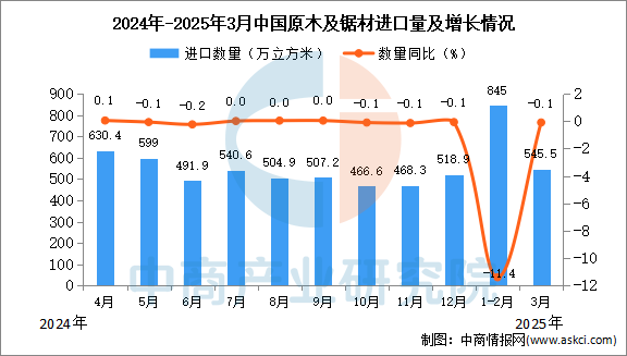 中商谍报网讯:据中商财产研究院数据库显示,2025年3月中国原木及锯材进口量545。5万立方米,同比下降0。1%;1-3月中国原木及锯材进口量1390。6万立方米,同比下降10。6%。