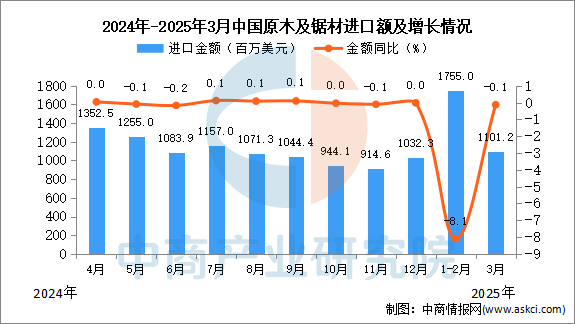 从金额方面来看,2025年3月中国原木及锯材进口金额1101。2百万美元,同比下降0。1%;1-3月中国原木及锯材进口金额2856。2百万美元,