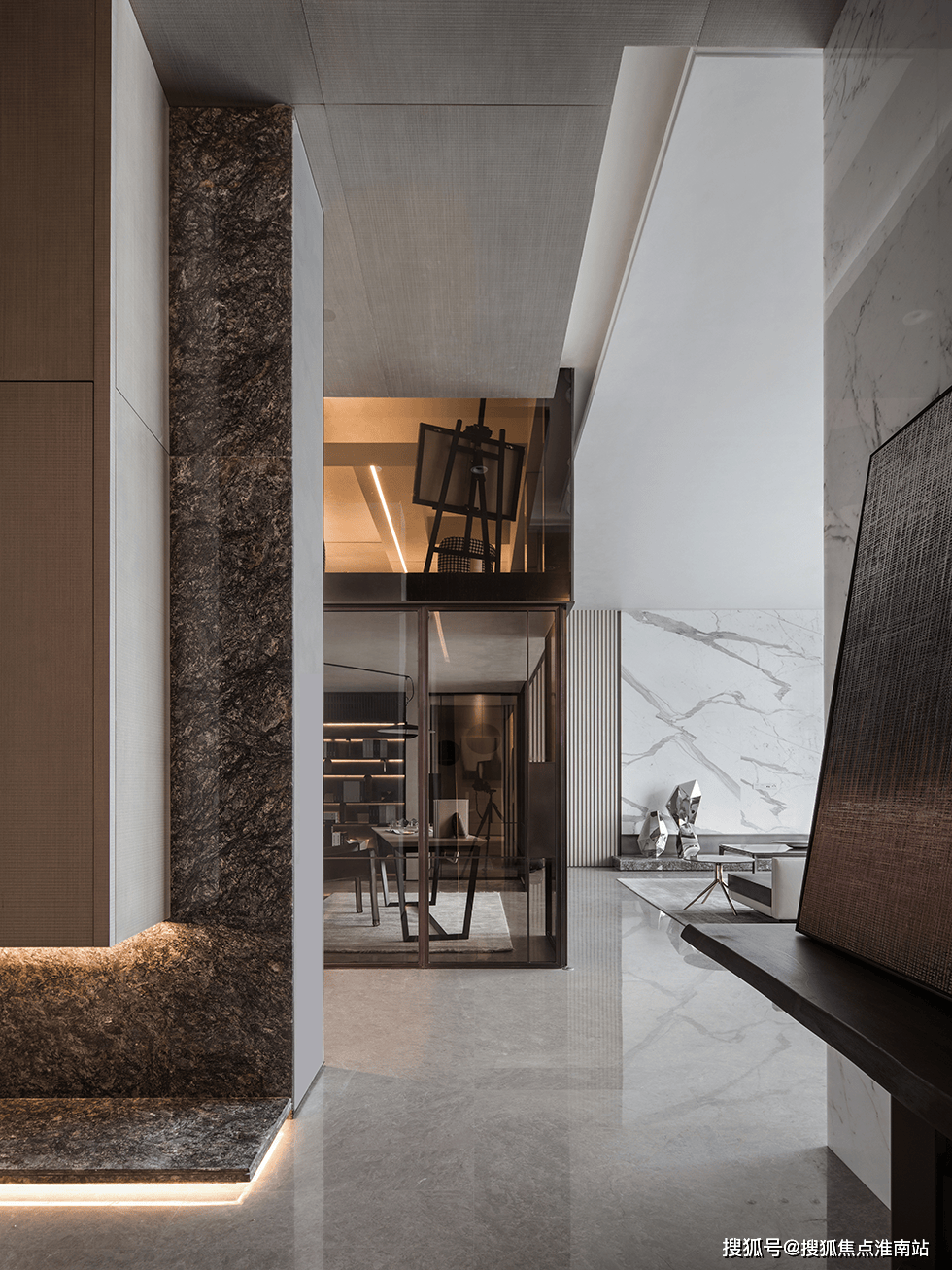 占领全体居所视觉中要的,是以鱼肚白大理石形成的客堂布景墙,线条了了,行云流水,仿佛拂晓山涧,都会中突显的天然气味。