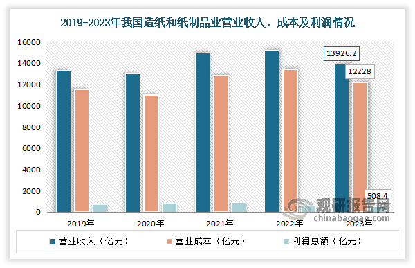 按照不雅研演讲网发布的《中国木材行业成长深度阐发取投资前景预测演讲(2024-2031年)》显示,颠末多年的成长,我国制纸工业逐渐成长强大,纸成品市场已从过去紧缺型变成根基均衡型,且已构成产需根基均衡的款式,大都产物已根基满脚国内市场需求。取此同时,制纸工业也越来沉视质量的提高。现正在正正在不竭调整财产布局,裁减规模小、污染大、能耗高的小型设备,同时积极投入高车速、大幅宽的新型制纸机。轮回、低碳、绿色经济曾经成为新的成长从题。虽然2023年因为市场需求削弱、以及外部变化等问题叠加,使得制纸行业全体出产和运转坚苦增加。但跟着财产对高质量成长和低碳绿色纸业的认识不竭提拔,通过加强立异能力,添加新动能,合理无效节制新减产能,制纸财产总体仍然连结不变成长态势。数据显示,2023年全国制纸和纸成品业停业收入13926。2亿元,同比下降2。4%;停业成本12228亿元,同比下降3。1%;利润总额508。4亿元,同比增加4。4%。
