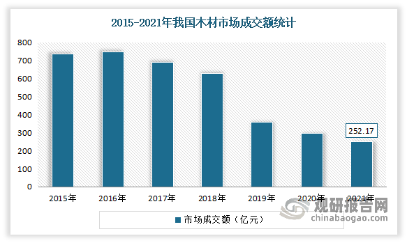 近几年正在大影响下,木材市场需求不旺,使得我国木材市场成交额不竭萎缩。按照数据显示,2021年我国木材市场成交额为252。17亿元,较2020年削减了42。95亿元,