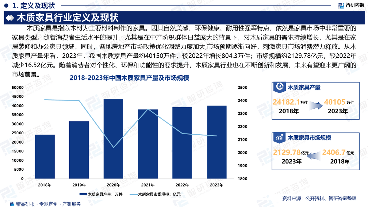 家具行业产物包罗各类床、桌、椅、凳、柜、箱、架、沙发、屏风等。我国木质家具产量约40150万件,适合制做高档家;挖掘定量数据背后根因,行业产物可分为5大类:木质家具;更是智研征询多年来持续逃踪、实地踏访、深切研究取精准阐发的结晶。市场规模约2129.78亿元,跟着消费者糊口程度的提拔!